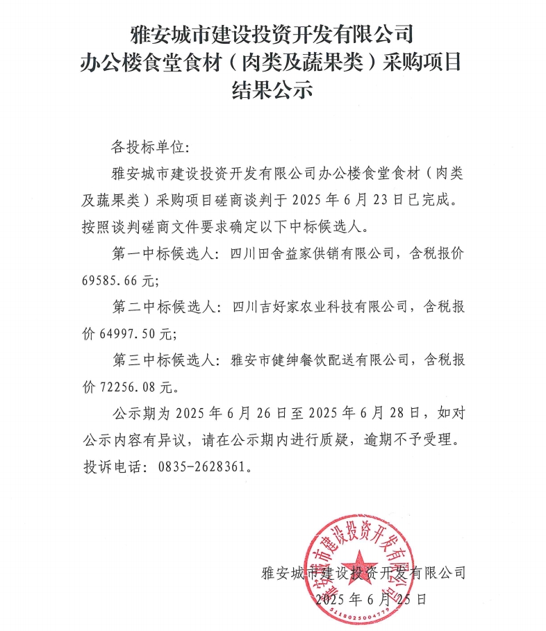 雅安城市建設(shè)投資開發(fā)有限公司城投辦公樓食堂食材(肉類及蔬果類)采購(gòu)項(xiàng)目結(jié)果公示